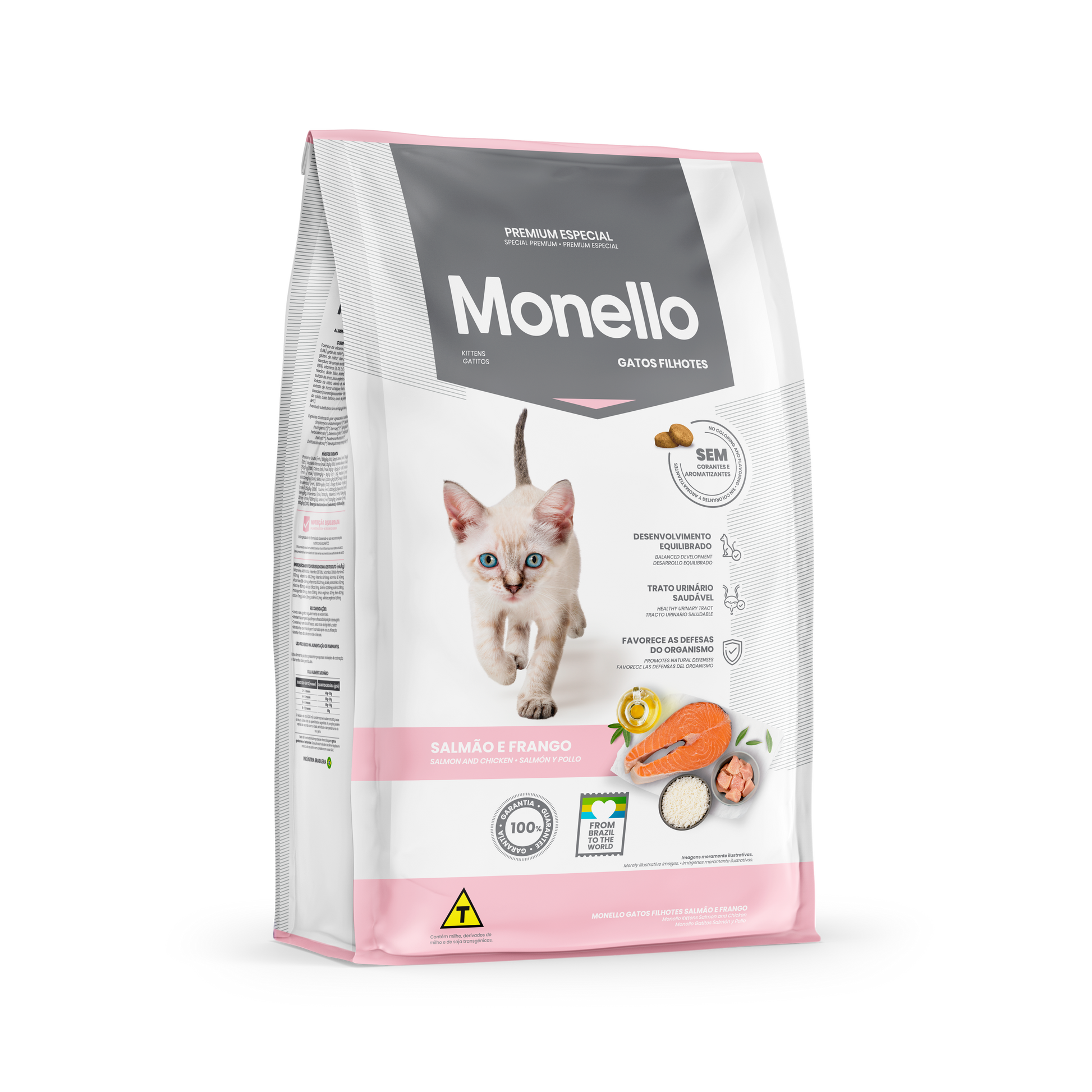 Monello Cat Gatitos Salmón y Pollo es un alimento especialmente desarrollado para apoyar el crecimiento sano, fuerte y equilibrado de los felinos bebés. Libre de colorantes y aromatizantes artificiales, conserva su receta original con la adición de harina y aceite de salmón, ingredientes nobles que fortalecen las defensas del organismo y estimulan el desarrollo cognitivo desde los primeros meses de vida.