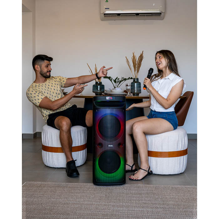 · Potencia: 550W / 14.000W PMPO.· Conexión inalámbrica V5.0.· Batería recargable: 3600mAh.· Conexión: USB (hasta 32 GB), Micro SD, Aux 3.5mm, Mic 6.35mm.· Luces Led Fire en todo el panel frontal (se pueden apagar).· Función TWS· Radio FM.· Ecualizador de 4 bandas,· Función Priorizar micrófono (Karaoke).· Función Grabación.· Display Led.· Portable: Manija y ruedas.· Incluye: Control remoto, Un micrófono inalámbrico, cable AUX,adaptador.